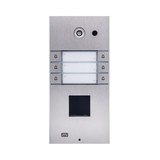 Analog Vario dveřní jednotka s šesti tlačítky, s jmenovkou, provedení niklovaná ocel, bez kamery, předpříprava pro RFID čtečku, analogová komunikace na ústřednu, napojení přímo na analogovou ústřednu, IP 53, 1x kontakt NO/NC pro ovládání zámku max. 30 V / 1 A AC/DC, montáž na povrch, rozměry 210 x 100 x 29 mm