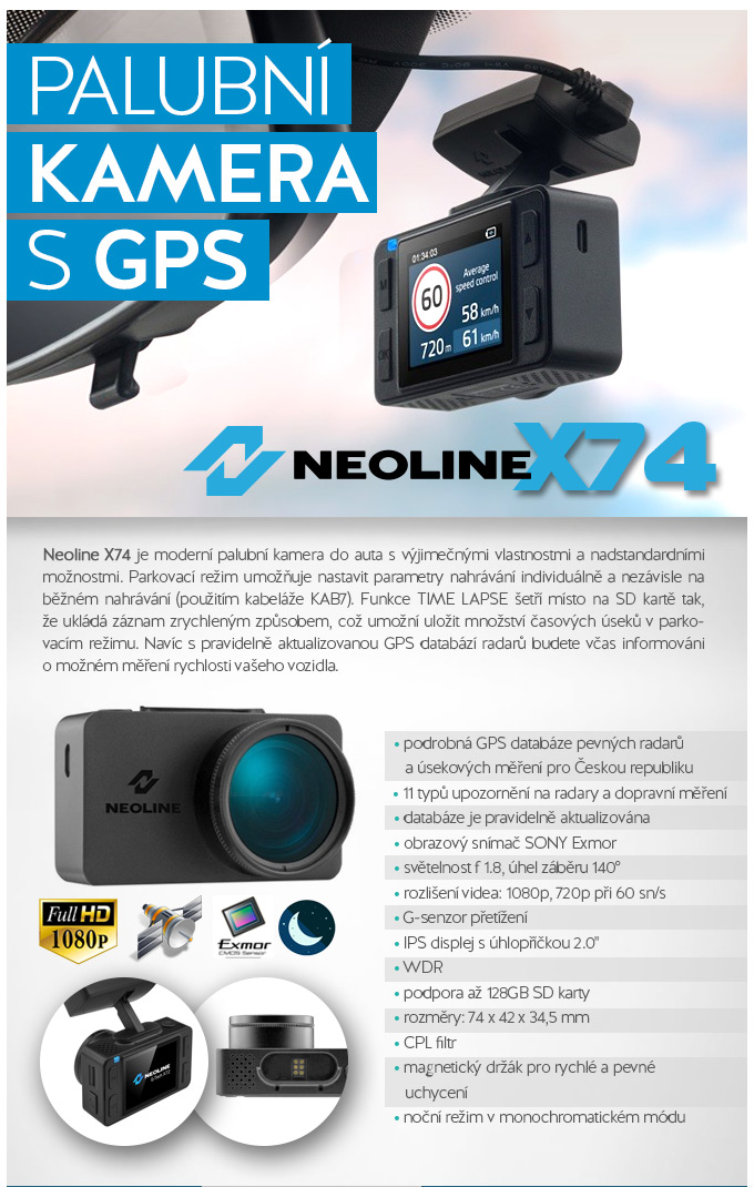 Neoline X74 - kamera do auta s GPS databází pevných radarů