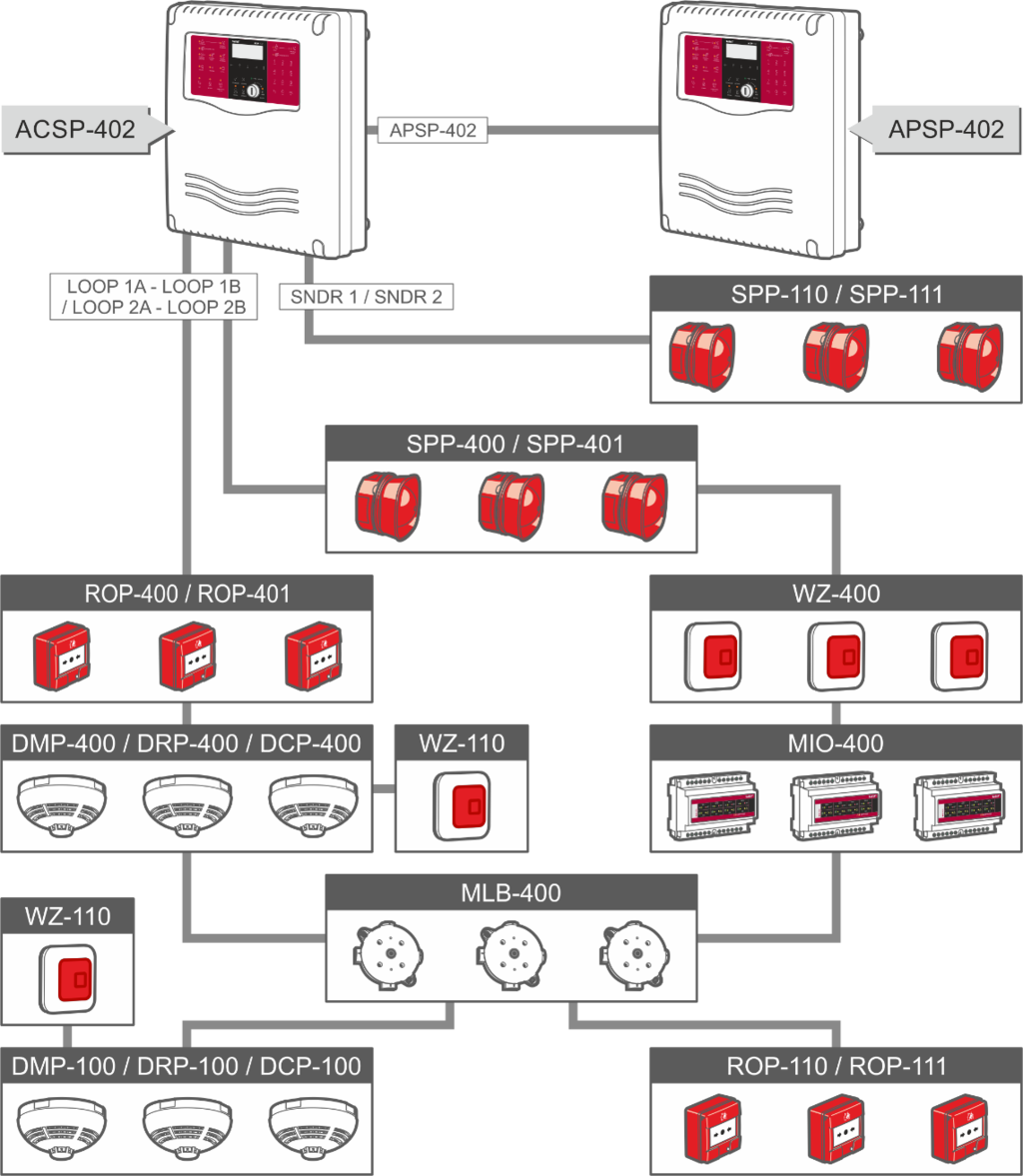 Ústředna ACSP-402 podporuje připojení 2 požárních smyček, přičemž každá z nich může obsahovat až 128 adresovatelných zařízení. Požární smyčky lze nahradit 4 požárními linkami a na každou linku lze připojit maximálně 32 adresovatelných zařízení. Systém umožňuje také připojení 1 požární smyčky a 2 požárních linek. Celý systém může obsahovat maximálně 256 adresovatelných zařízení. Ústředna je osazena LCD displejem a má kompletní české/slovenské uživatelské rozhraní.