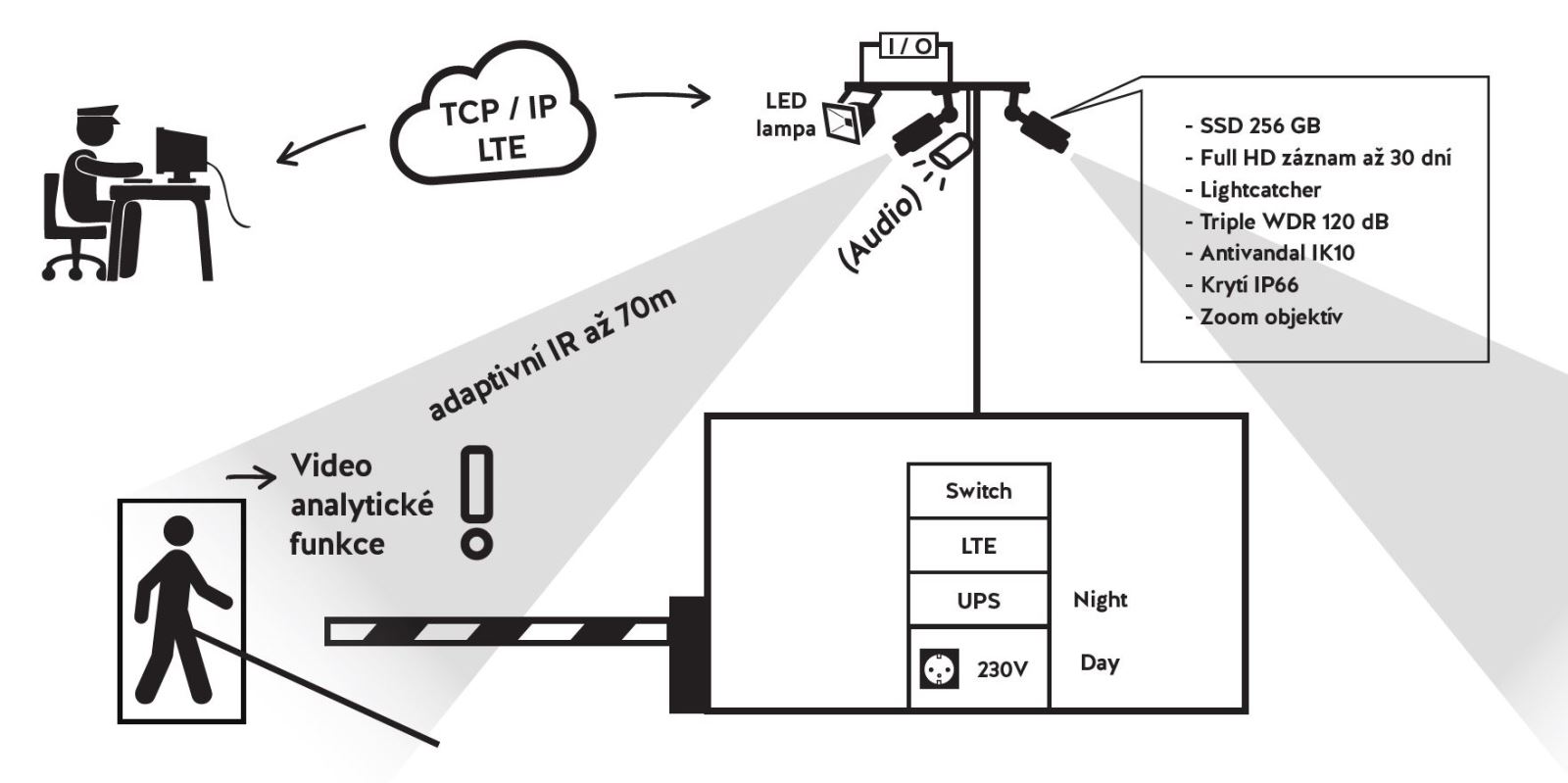 Pro snadnou obsluhu je žádoucí ke kamerovému bodu připojit switch, který může obsahovat přímo i LTE modem pro vzdálenou komunikaci. Důležité je záložní napájení ať již v podobě UPS nebo napájecího zdroje a záložní baterie.