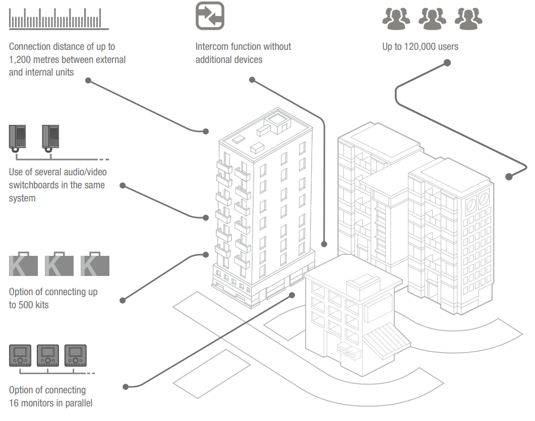 Kam se Comelit posunul u využití dvojvodiče, díky své 59ti leté historii, dobře ilustruje následující schéma. Je zde patrné, že v dnešní době lze připojit dokonce 120 000 uživatelů na vzdálenost až 1200 metrů od dveřní jednotky. Pro dnešní systémy není problém využívat více dveřních jednotek, nebo dokonce až 16 paralelních vnitřních telefonů.