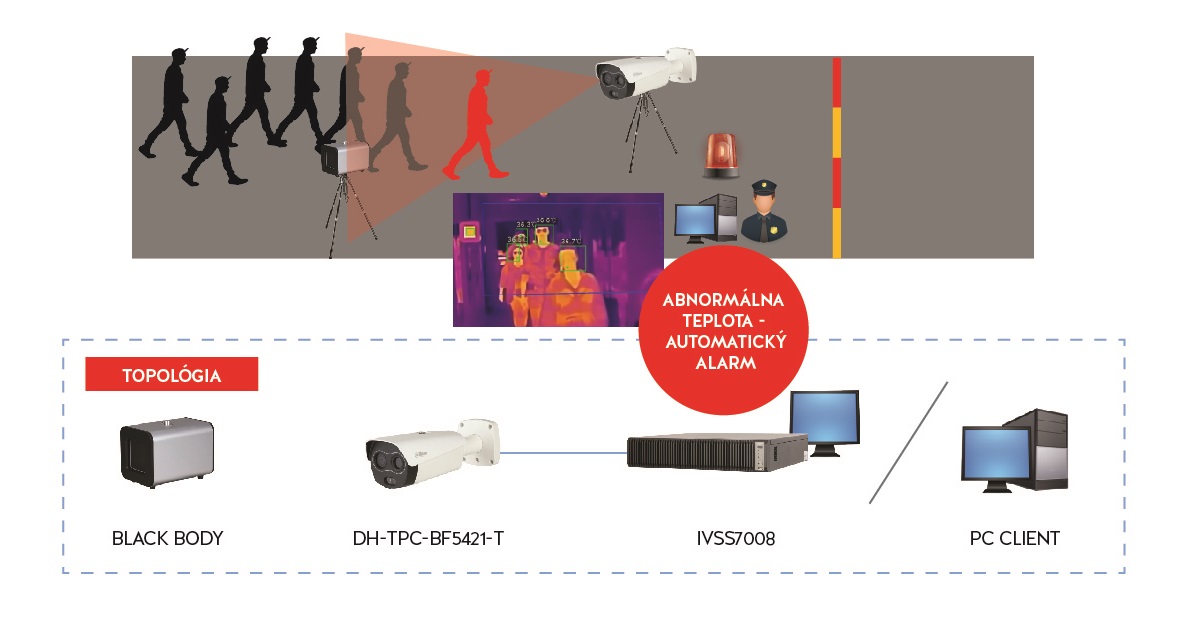 Pokud kamera zaznamená osobu se zvýšenou teplotou nebo bez nasazené roušky, automaticky spustí poplach a odesílá tuto informaci do IVSS. Díky tomu pak osobu identifikují pracovníci bezpečnostní služby a mohou pohotově zareagovat přímo na místě. Nechybí ani možnost automaticky přehrát zvolený zvuk (hlášení) nebo spustit LED světelnou signalizaci, která je umístěna v přední části kamery.
