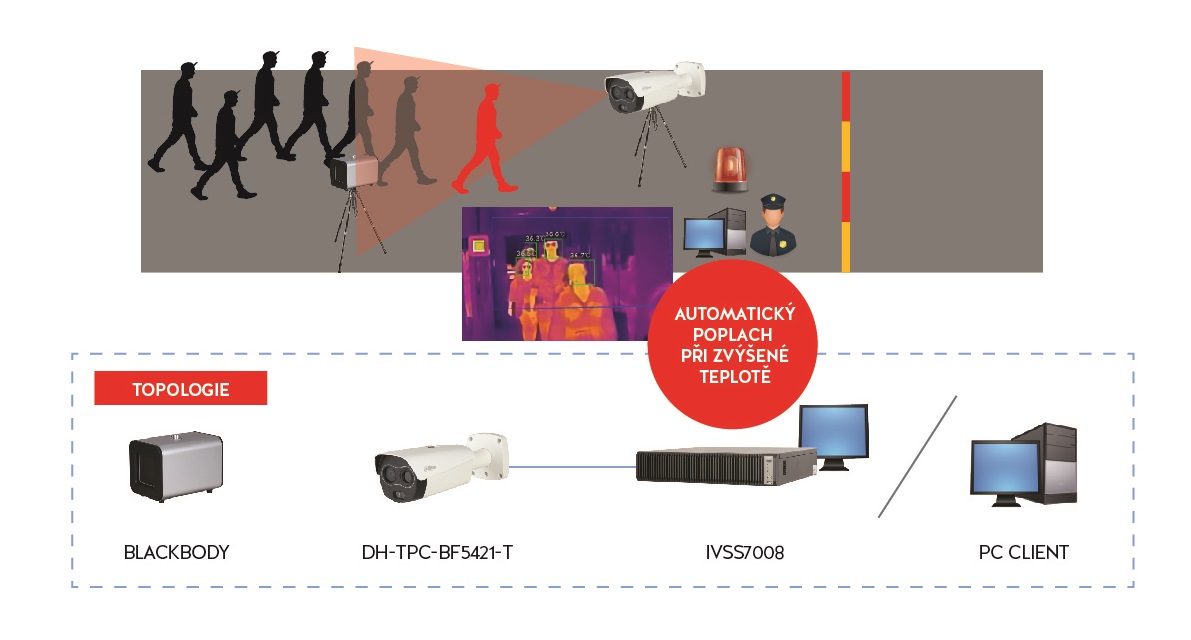 Řešení pro hromadné měření tělesné teploty osob je postaveno na použití kombinace speciální průmyslové kamery a referenčního teplotního bodu. Získaný záznam se ukládá na záznamové zařízení s pevným diskem vhodným pro nepřetržitý provoz 24 hodin / 7 dní v týdnu. Živý obraz s okamžitým vyhodnocením teploty jednotlivých osob, upozornění na osoby se zvýšenou teplotou i uložený záznam lze sledovat prostřednictvím uživatelsky přívětivého rozhraní na monitoru.