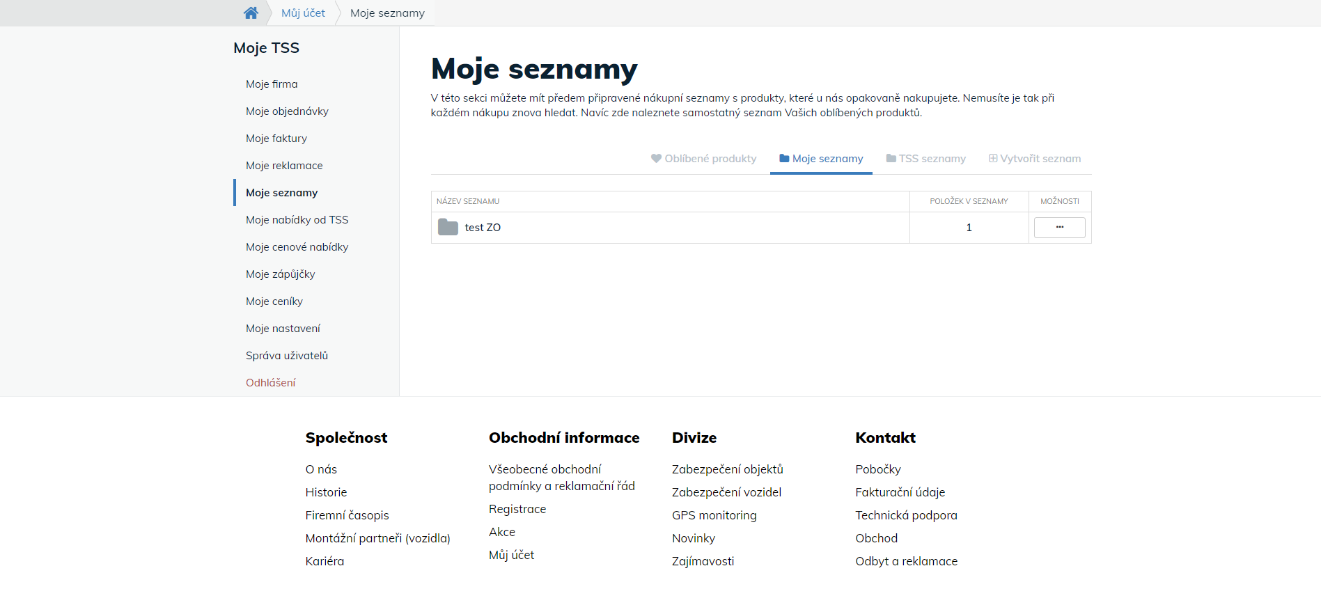 Často nakupujete stejnou skupinu produktů? Využijte možnost mít předem připravené nákupní seznamy s produkty, které u nás opakovaně nakupujete. Nemusíte je tak při každém nákupu znova hledat. Vybraný konkrétní produkt můžete buďto přímo přidat do zvoleného seznamu nebo můžete u produktu seznam nový. Všechny tyto seznamy pak naleznete v klientské zóně Moje TSS v sekci Moje seznamy / záložka Moje seznamy.