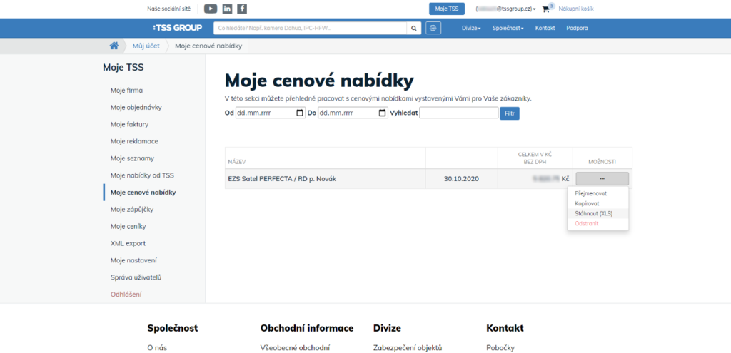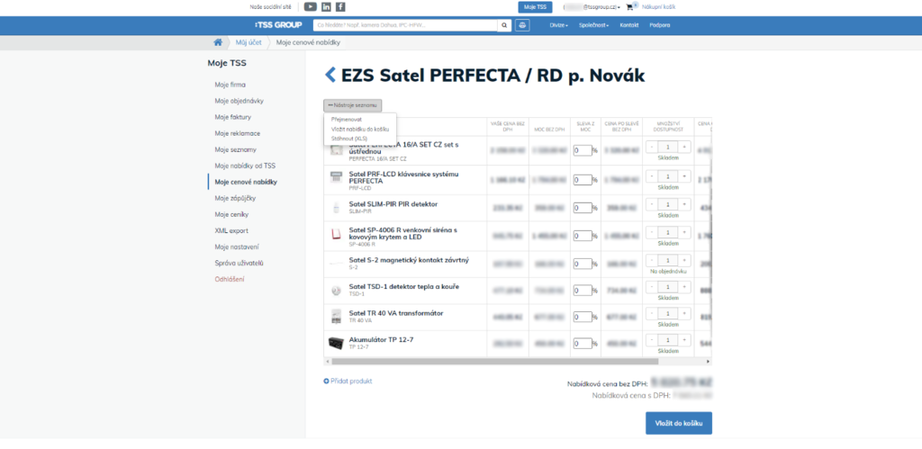 Chcete nabídnout svému zákazníkovi produkty z našeho portfolia? V takovém případě můžete využít možnost vytvořit tuto cenovou nabídku přímo v klientské zóně Moje TSS v sekci Moje cenové nabídky. Zde si můžete nabídku nejprve pohodlně připravit a poté jednoduše exportovat do XLS souboru připraveného pro tisk. Nechybí ani možnost vložit nabídku přímo do košíku.