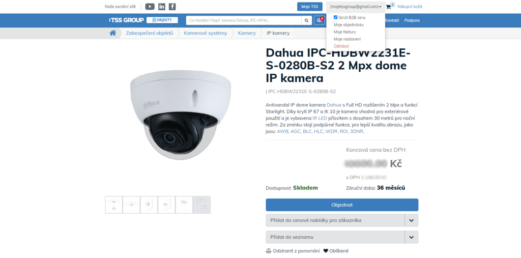 Potřebujete prezentovat zákazníkovi produkt přímo na našich stránkách, ale potřebujete "vypnout" zobrazování vašich cen? Žádný problém. V záhlaví stránky klikněte na váš přihlašovací e-mail a poté klikněte na první možnost "Skrýt B2B ceny".