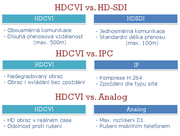Závěrem přidáváme přehlednou tabulku pro porovnání hlavních výhod HDCVI s konkurencí v podobě analogu, HD-SDI a IP technologie.