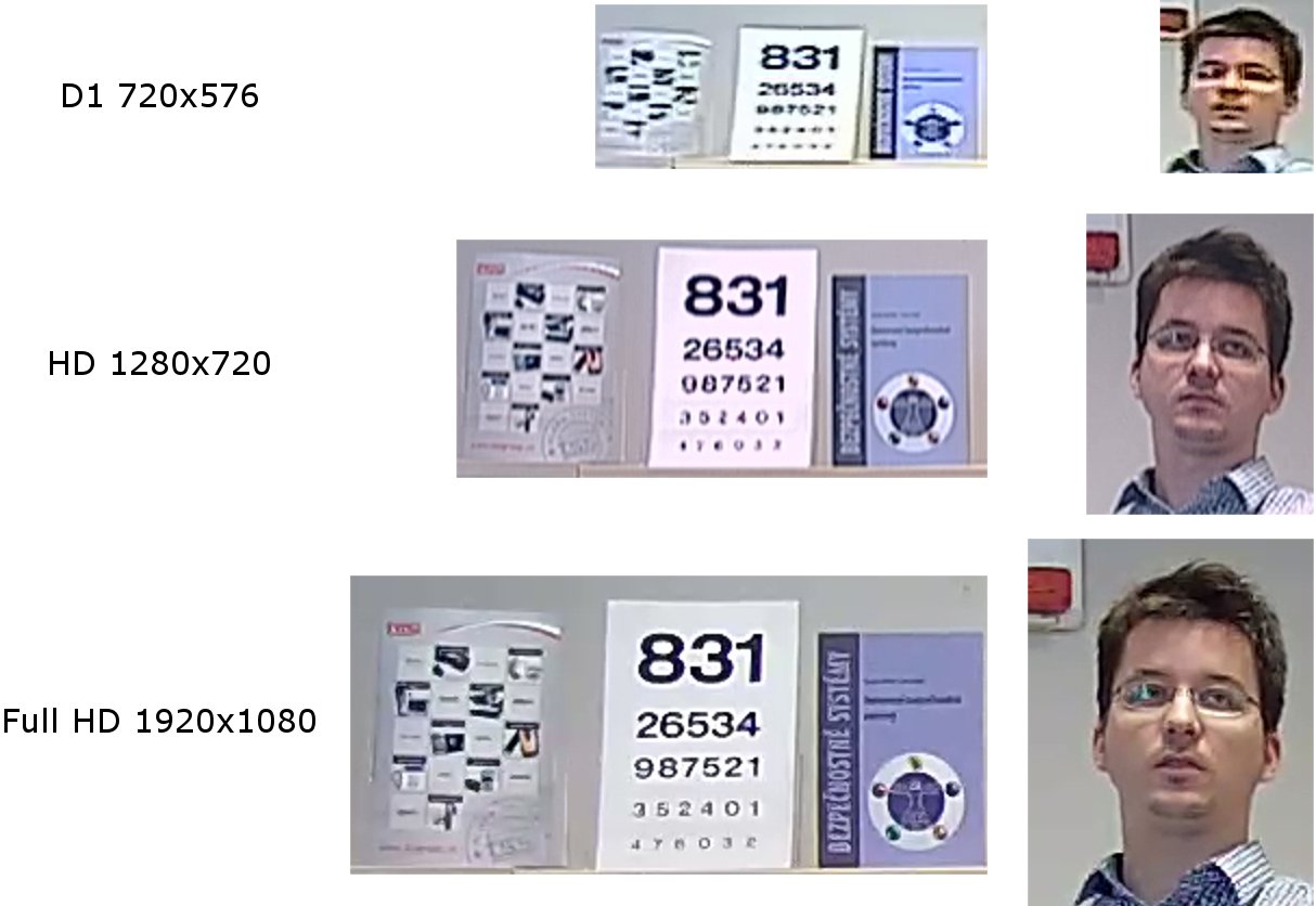 Ukázka detailu znázorňuje výřezy z obrazu, které jsou zvětšené na dvojnásobnou velikost. Je zřejmé, že už na vzdálenosti 4m je HD obraz ostřejší v každé jeho části a je schopen poskytnout kvalitnější informace k následnému vyhodnocení.