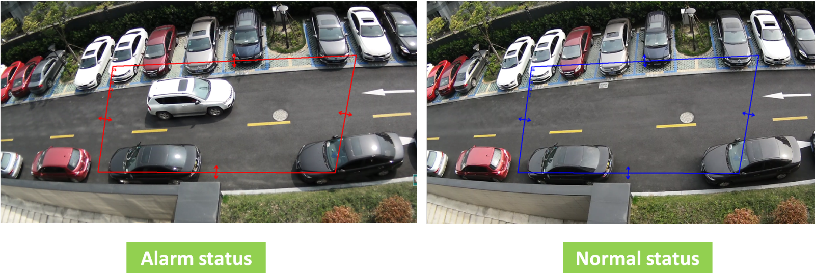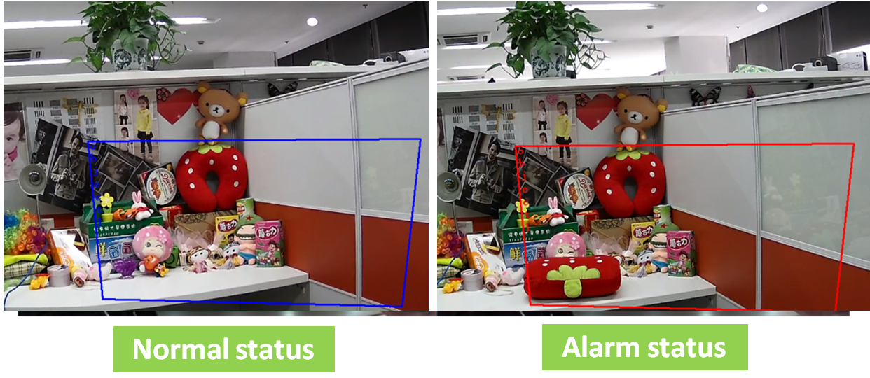 Kamera provádí kontrolu oblasti a upozorní na přidaný objekt, který se delší dobu zdržuje ve vyznačeném prostoru a nebyl jeho součástí při zadávání kritérií detekce.
