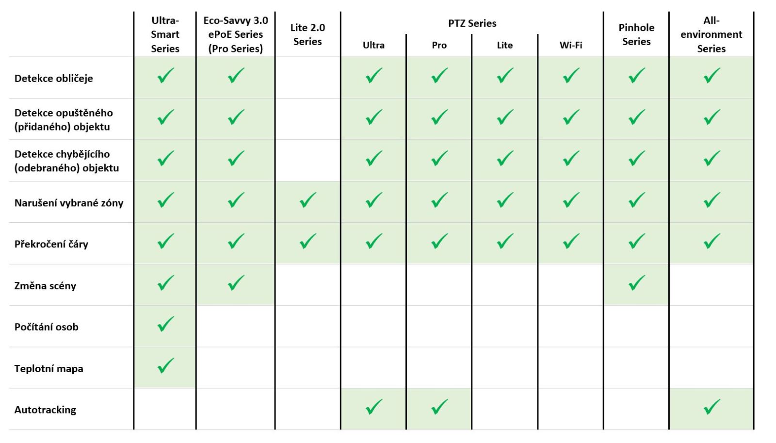 Připravili jsme praktický přehled dostupnosti inteligentních a analytických funkcí u jednotlivých modelových řad kamer a záznamových zařízení Dahua. Dále jsme přidali popis těchto funkcí.