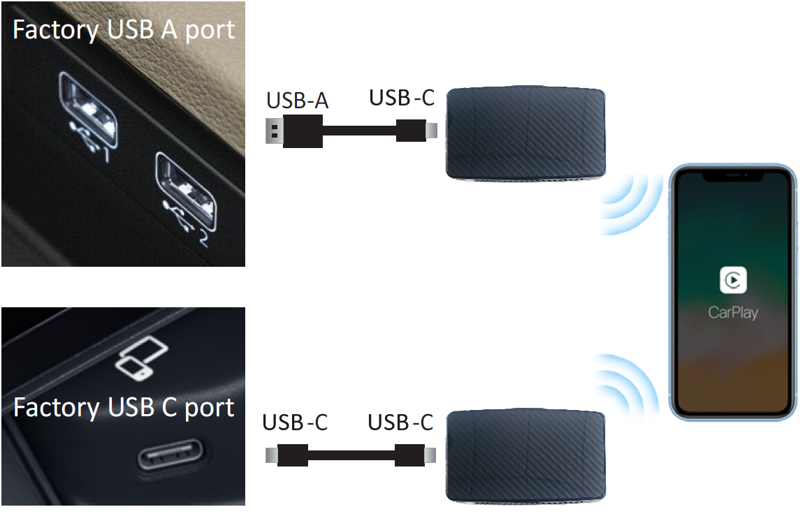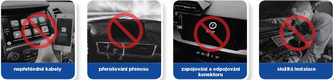 - převádí OEM CarPlay / Android auto po kabelu na bezdrátové