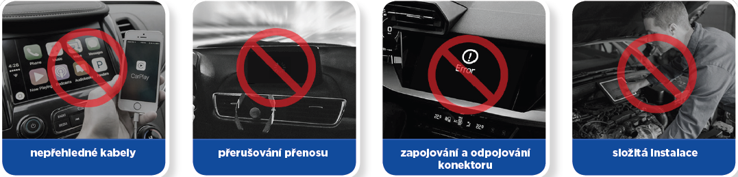S miniaturním modulem CA505 není více třeba připojovat telefon do USB vozidla. Připojení s Apple CarPlay / AndroidAuto jednotkou vozidla proběhne automaticky přes WiFi, vždy po zapnutí zapalování. Modul zůstává trvale připojen do USB jednotky vozidla namísto telefonu a Vy si můžete užívat svobody bez kabelu.