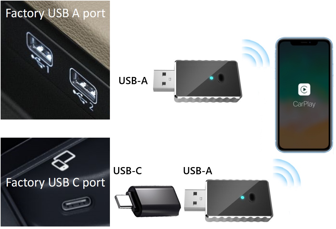 Univerzální miniaturní adaptér pro bezdrátové připojení Apple CarPlay / AndroidAuto. Určen pro vozidla s jednotkou Apple CarPlay/Android Auto s připojením po kabelu. Ovládání podporovaných aplikací zůstává zachováno dotykovým displejem, tlačítky na volantu, případně jiným způsobem. Jednoduché zapojení modulu - do USB slotu vozidla určeného pro telefon. Telefon se připojuje k jednotce vozidla přes modul automaticky (po prvotním BT spárování).
