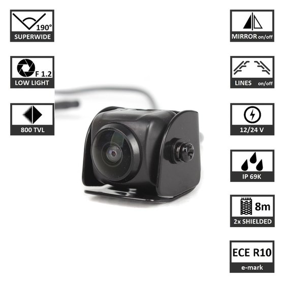 Univerzální miniaturní parkovací kamera s úhlem záběru 190°, pro venkovní instalaci IP69K, s rozlišením 800TVL, použití jako zadní nebo přední, odolné kovové tělo, s možností zapnutí vodicích linek a změny orientace levé/pravé strany obrazu. Sklon kamery je nastavitelný a lze ji tak instalovat na horizontální nebo vertikální plochu. Kameru lze instalovat i bez držáku (nalepením), poté má rozměry jen 21 x 24 x 21 mm.