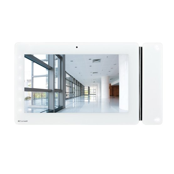 Bílý videomonitor pro VIP sytém s širokoúhlou obrazovkou o úhlopříčce 7". Monitor je vybaven dotykovými tlačítky pro ovládání zámku a volně programovatelné funkce. Zařízení je vybaveno kontaktem přídavného vyzvánění od dveří bytu a impulsním výstupem pro doplňkový externí zvonek Comelit 1229.