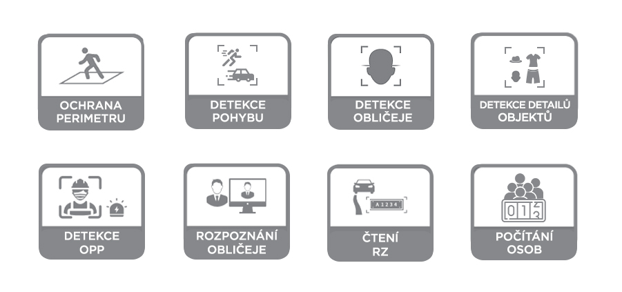 | Inteligentní funkce | IVS (Perimetr Protection), PPE Detection, ANPR / LPR, SMD, Face recognition, Face detection, Heatmaps, Acupick, Parking Space Management, Video metadata, Smart object detection, Smart search, People counting |