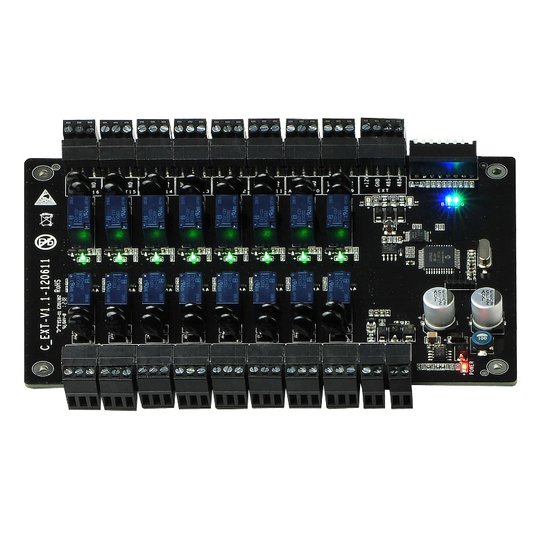 Rozšiřující modul pro IP přístupový kontrolér ovládání výtahů, 16x NO/NC reléový výstup, připojení max. 3ks přes RS485 ke kontroléru C10 umožňuje ovládání celkem 58 pater, napájení 12VDC, odběr max. 1,5 A/12VDC (zdroj není součástí), rozměry 130x110x60mm (vhodná inst. krabice KR380), provedení plošný spoj, interiérové použití