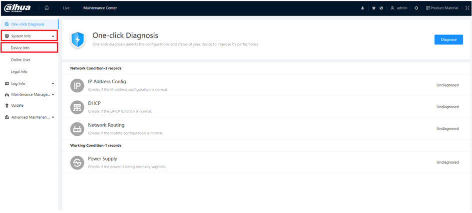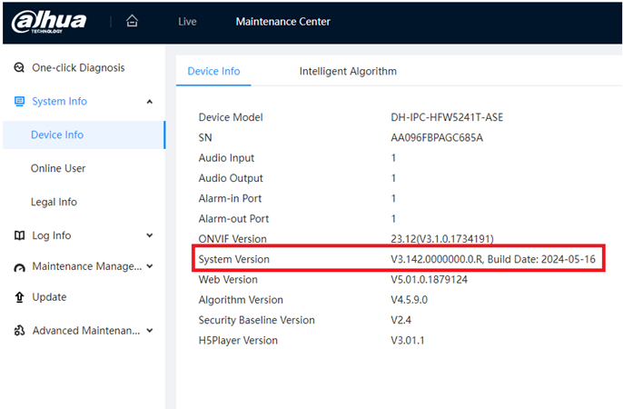 Existuje několik způsobů, pomocí kterých je možné zjistit aktuální verzi firmvéru nainstalovaného v kameře. Nejjednodušší a nejrychlejší způsob je přihlásit do kamery pomocí webového rozhraní. Po přihlášení ve webovém prohlížeči projdeme kliknutím na ozubené kolečko do menu Maintenance Center - System info - Device info. Na této kartě se zobrazí verze firmvéru.