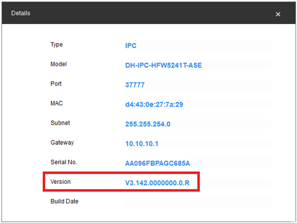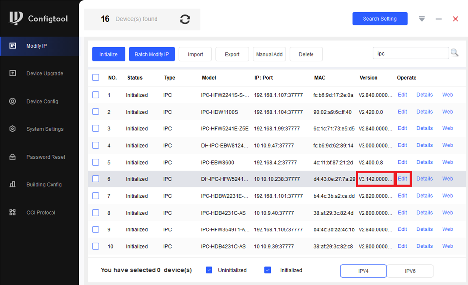 Další metodou, jak ověřit verzi firmvéru kamery je použití konfiguračního nástroje ConfigTool. V prvním kroku v části Search Setting zadáme přihlašovací jméno a heslo do kamery, jejíž firmvér chceme aktualizovat. Na kartě Modify IP vyhledáme požadovanou kameru. Ve sloupci Version najdeme u každého zařízení jeho aktuální verzi softwaru. Případně můžeme kliknout na Device, kde najdeme více informací o kameře.