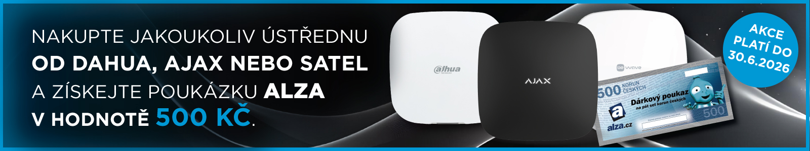 Nakupujte jakékoliv ústředny značek DAHUA, AJAX nebo SATEL a získejte od nás automaticky za každou ústřednu dárkovou poukázku ALZA v hodnotě 500 Kč.