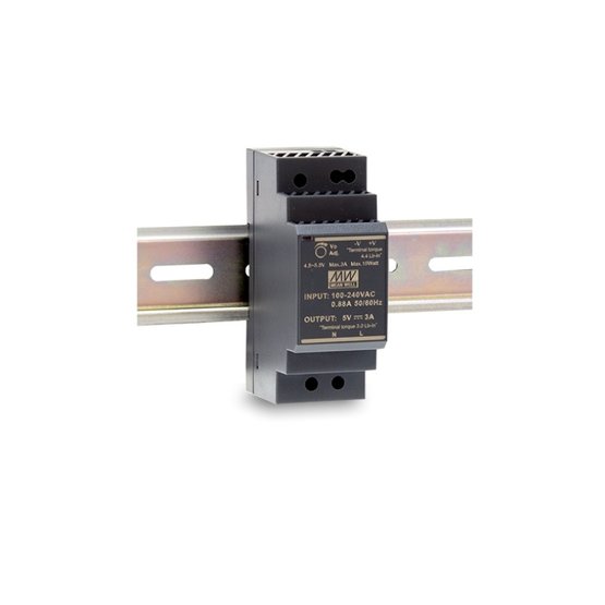 Napájecí zdroj 15 V DC / 2 A, instalace na DIN lištu (2 moduly), plynulá regulace trimrem 13,5–16,5 V DC