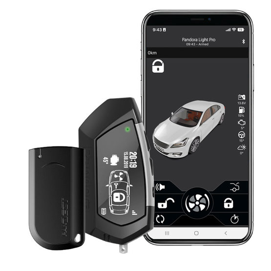Pandora LIGHT PRO je nejvyšší řadou produktů určených pro offline zabezpečení. Doposud žádný systém bez měsíčních poplatků, neumožňoval ovládání pomocí moderního 2 cestného ovladače a mobilní aplikace zároveň. Díky novému systému Pandora Light Pro a technologii Bluetooth 5.0 je to nyní možné. Ovladač s velkým a přehledným OLED displejem a technologií LoRa (Long Range) nyní poskytne podrobný přehled o stavu vozidla a to i na velkou vzdálenost. Přehledná mobilní aplikace umožní kompletní ovládání smartphonem v dosahu Bluetooth. Mezi komfortní funkce také patří možnost dálkově nastartovat vozidlo a tím vyhřát, případně vychladit interiér, ale i funkce pro aktivaci nezávislého topení. Zabudovaný Bluetooth modul také umožňuje použití bezkontaktních přívěsků, případně samotného smartphonu pro autorizaci řidiče. Homologace EHK 116, certifikované a schválené TÜV SÜD.