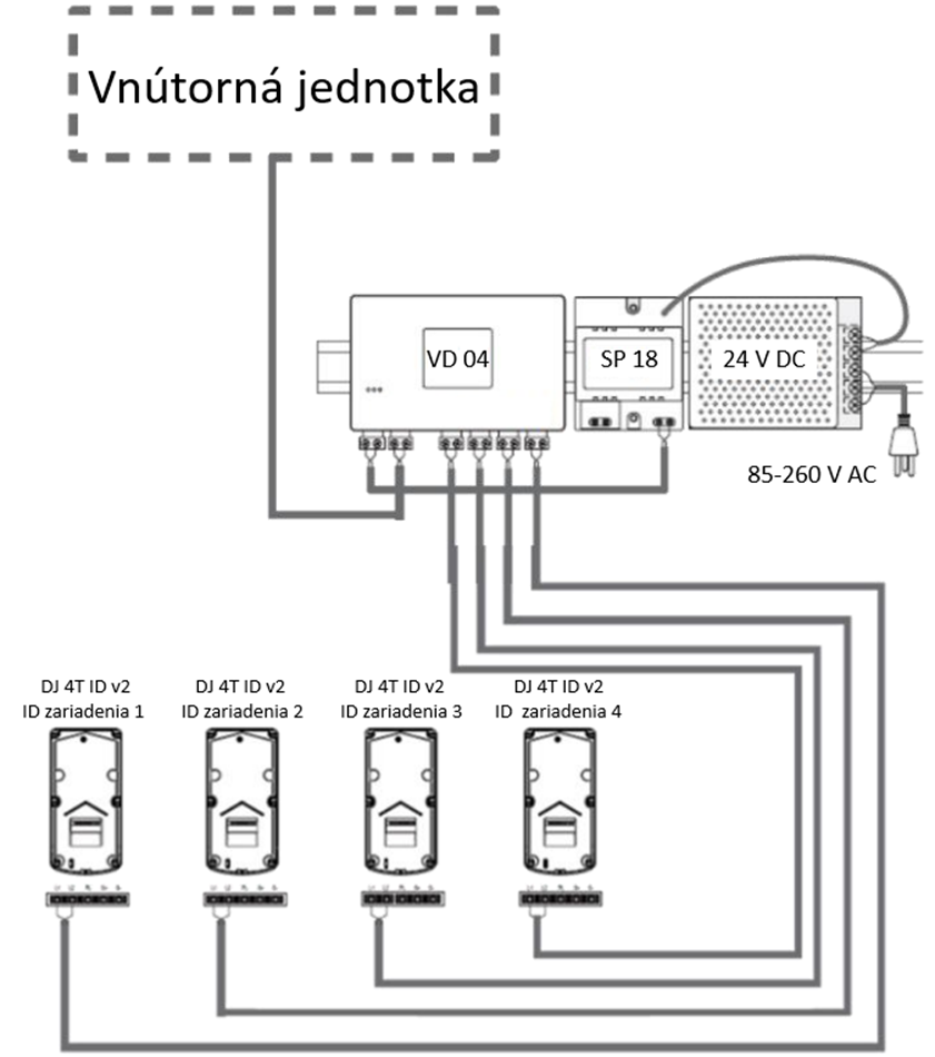V případě, že používáme více dveřních jednotek DJ 4T v2, které jsou v systému vzájemně propojeny, je nezbytné individuální nastavení adres na každé dveřní jednotce. Musíme však myslet na skutečnost, že systém podporuje maximálně 4 dveřní jednotky. Každá dveřní jednotka musí mít svou jedinečnou adresu. V případě tohoto typu dveřních jednotek nenastavujeme adresy pomocí žádného DIP přepínače. Pro tento účel je nezbytné, aby systém obsahoval i distributor VD 02 nebo VD 04 (liší se v závislosti na počtu výstupů pro připojení dveřních jednotek, audio telefonů, video monitorů).