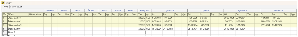- Na nastavení státních svátků použijeme 4 časovače. V našem příkladu jsou to časovače 1 až 4. Do výjimek zadejte postupně všechna data státních svátků. Automatické armování/odarmování systému je v našem příkladu nastaveno na každý den - zapnutí ve 22:00 a vypnutí v 5:00. Během zadaných dnů ve výjimkách, systém nezmění svůj stav a v našem příkladu zůstane zaarmovaný.