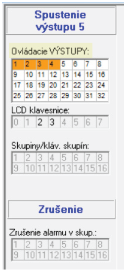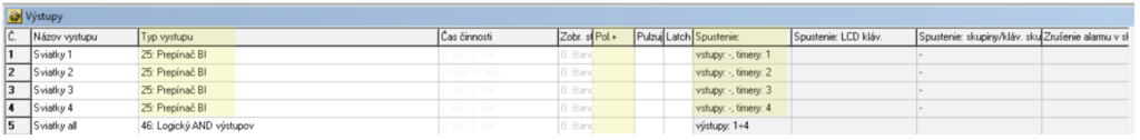 - Další výstup, v našem příkladu výstup č. 1 5 nastavte na: Typ výstupu 46: Logický AND výstupů. I v tomto případě ve sloupci „Pol. +“ odstraňte X! V části „Spuštění výstupu“ označte Ovládací VÝSTUPY 1 až 4. Tento výstup využijeme k ovládání virtálního vstupu kterým budeme armovat / odarmovávat systém.