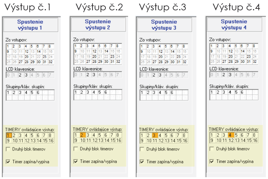 - Nastavte 4 virtuální výstupy na: Typ výstupu 25: Přepínač BI. V našem příkladu jsou to výstupy č.1 až 4. V části „Spuštění výstupu“ zapněte všem 4 výstupům možnost Timer zapíná/vypna a každému výstupu přidělte jeden ovládající timer. Ve sloupci „Půl. +“ odstraňte X!