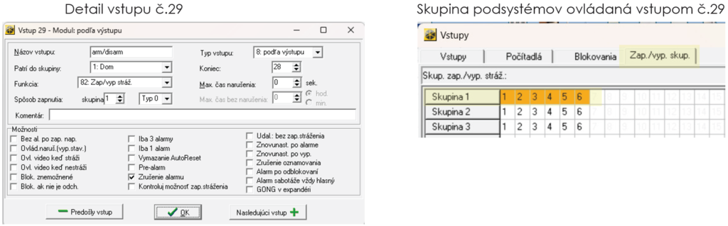 - Nastavte virtuální vstup na: Typ vstupu 8: Podle výstupu. Ve sloupci Citlivost zadejte výstup podle kterého se bude vstup ovládat. V našem příkladu je to výstup č.5. Ve sloupci Funkce zadejte možnost: 82: Zaap/vyp stráž. Pokud se bude automaticky armovat/odarmovávat pouze jeden podsystém, ve sloupci Skup. zvolte požadované číslo podsystému. V případě, že chcete ovládat více podsystémů najednou, musíte nejdříve v záložce Zap./vyp. skup. vytvořit skupinu kde označíte podsystémy které se mají ovládat. Když máte skupinu podsystémů vytvořenou, opět v záložce Vstupy ve sloupci Vstupní čas zadejte dvě číselné hodnoty : první číslo z leva je pořadové číslo vytvořené skupiny podsystémů a druhé číslo představuje způsob zapnutí hlídání skupiny podsystémů - Typ: 0, 1, 2 nebo 3. V našem příkladu jsme použili vstup č.k. 29.