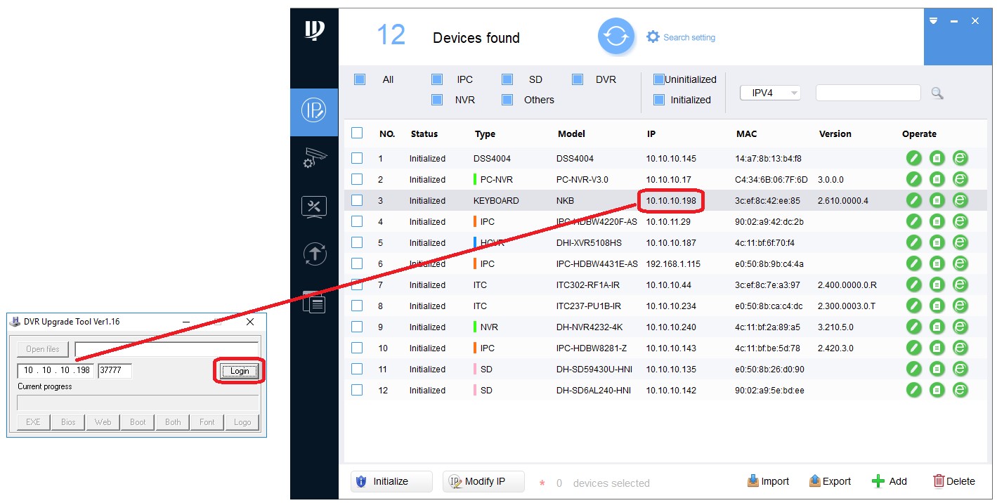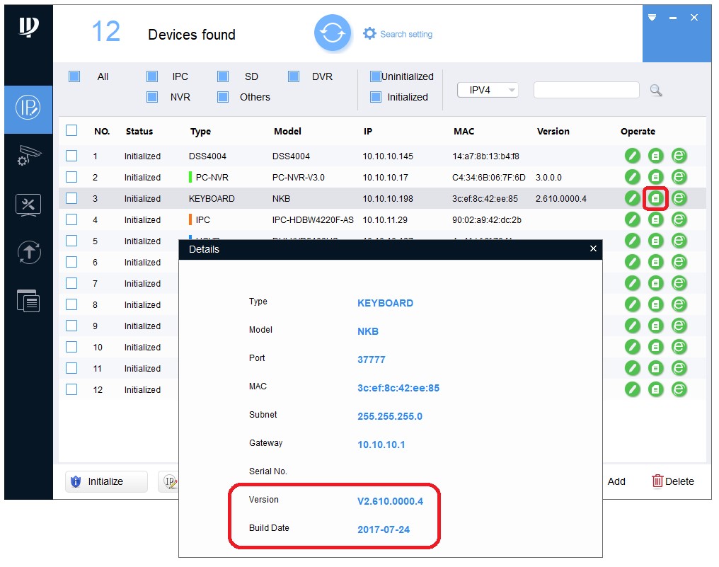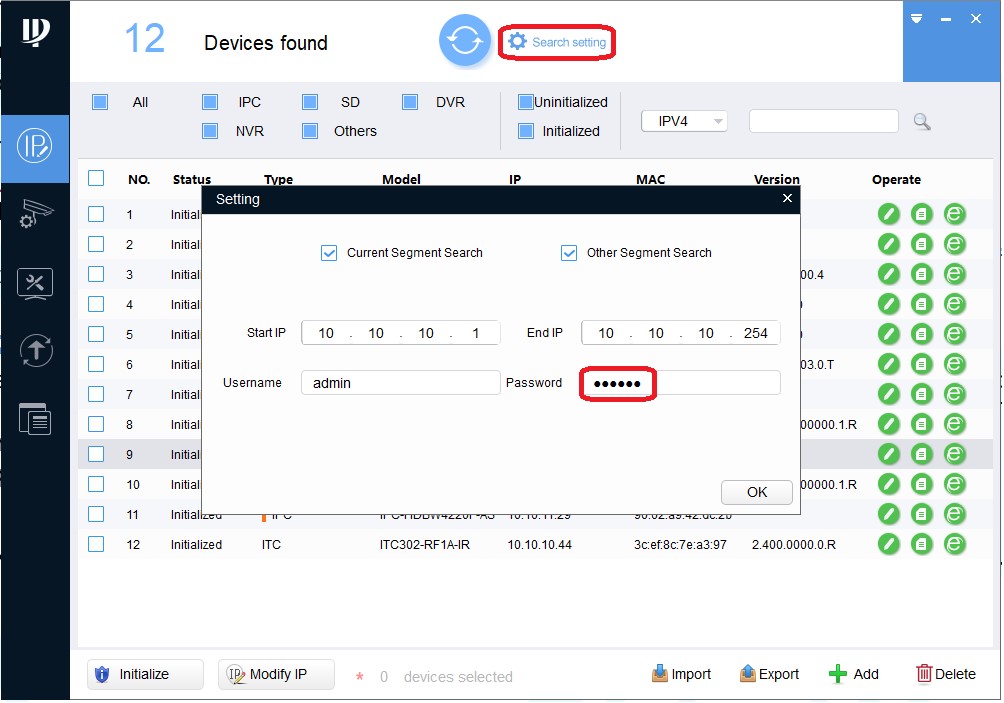 Další způsob kontroly verze firmware klávesnice je pomocí funkce Config Tool. V menu Search setting zadejte heslo pro admin účet do klávesnice a potvrďte OK. Poté klikněte na ikonu listu pro zobrazení verze firmware.