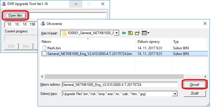3. Dále klikněte na ikonu Open files, vyberte soubor s aktuálním firmware a klikněte na ikonu Otevřít