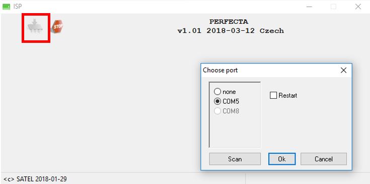 Spusťte program PERFECTA na počítači s aktuální verzí. Potom klikněte na ikonu Program. V okně, které se otevře, vyberte správný COM port. Kliknutím na tlačítko OK potvrďte svůj výběr.