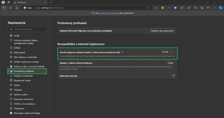 - Klikneme na Výchozí prohlížeč a poté povolíme režim IE.