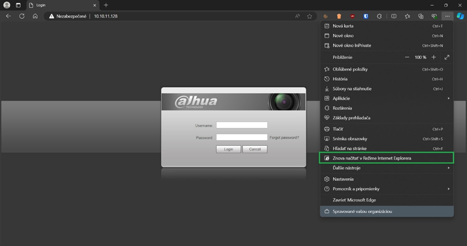 U starších kamer Dahua, které nejsou kompatibilní s novějšími prohlížeči, je nutné použít Internet Explorer nebo Edge v režimu kompatibility.