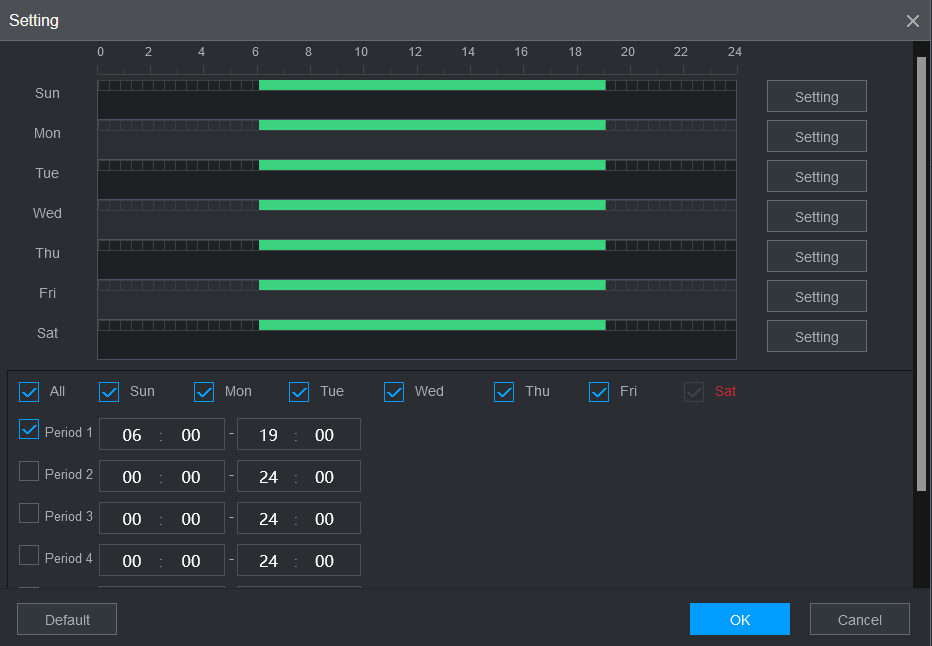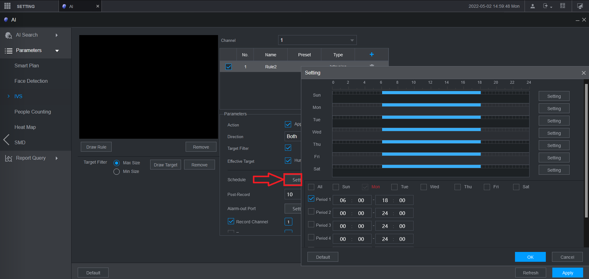 Při nastavení IVS - INTRUSION jsem nastavil kalendář aby bylo pravidlo aktivní během dne v době od 6:00 do 18:00.