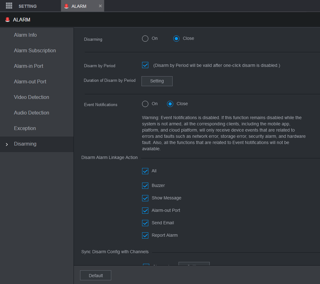 Možnosti EVENT NOTIFICATION, DISARM ALARM LINKAGE ACTION a SYNC DISARM CONFIG WITH CHANNELS nám umožňují zvolit si, co všechno má být zakázáno po aktivování DISARMINGU nebo období nastaveném v možnosti DISARM BY PERIOD.
