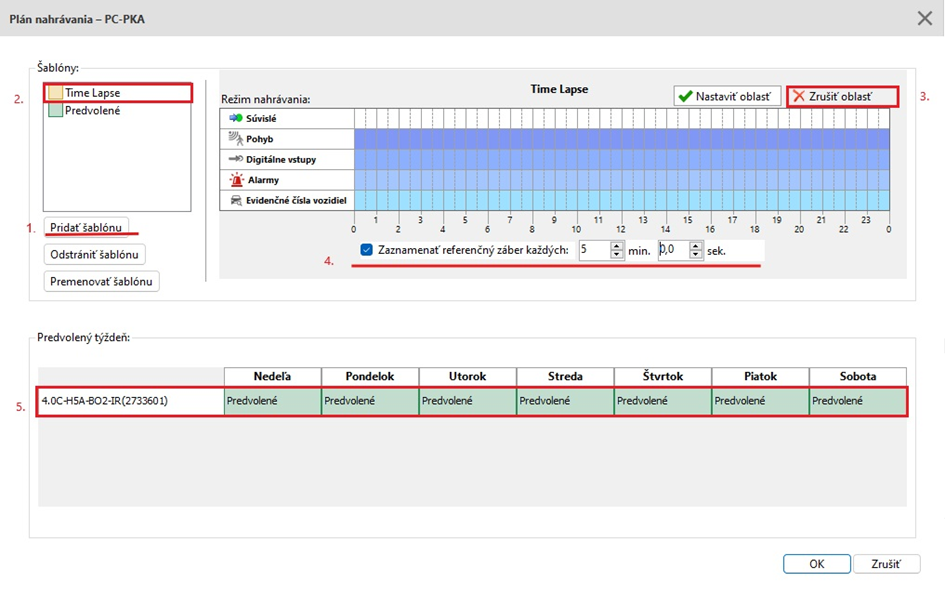- Použijte nově vytvořenou šablonu pro vybranou kameru a odpovídající dny, poté potvrďte tlačítkem OK.