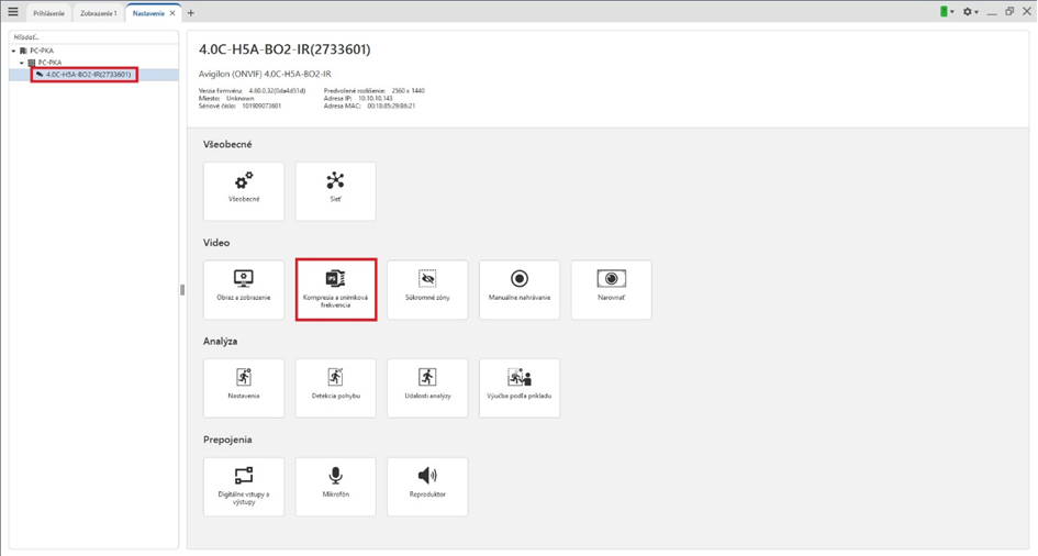 - V nastavení kamery vyberte možnost Komprese a snímková frekvence.