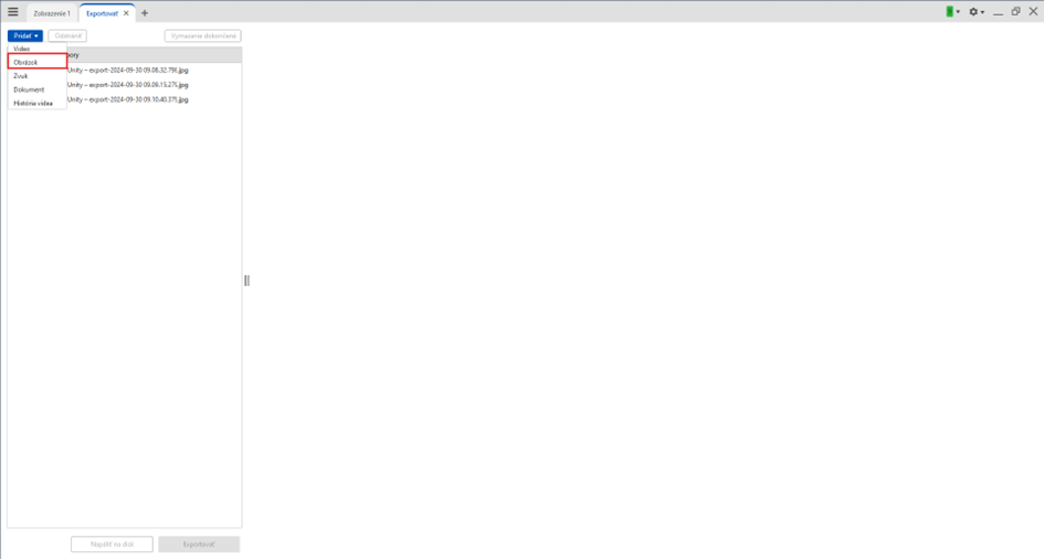 - V levém horním rohu klienta Avigilon Control Center klikněte na možnost Nová úloha a poté vyberte možnost Exportovat.