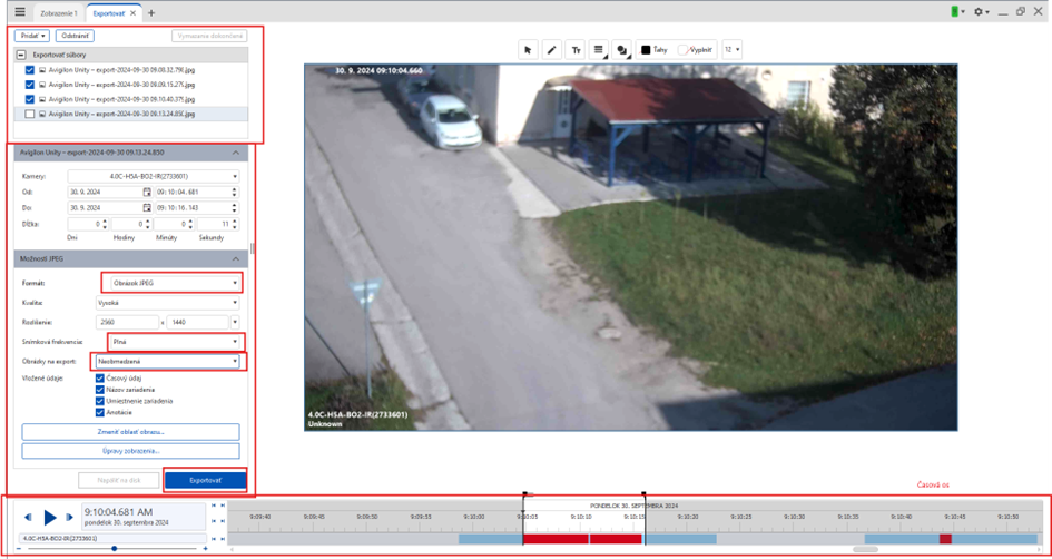 - Z nabídky Formát vyberte možnost Obraz JPEG a vyberte fotoaparát, který zaznamenal časosběrné snímky. Zadejte časové období, ze kterého chcete snímky exportovat a nastavte Kmitočet snímků na hodnotu Plný. Poté v části Obrázky pro export zadejte Neomezený.