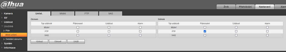 V sekci Úložiště nastavíme interval pro ukládání obrázků. V Kalendáři nastavíme období pro ukládání snímků. V sekci Cíl nastavíme cíl úložiště FTP a nastavíme parametry FTP.