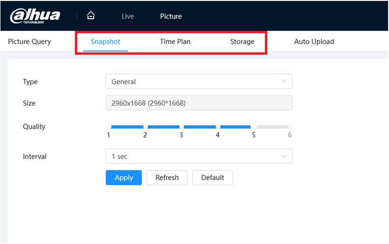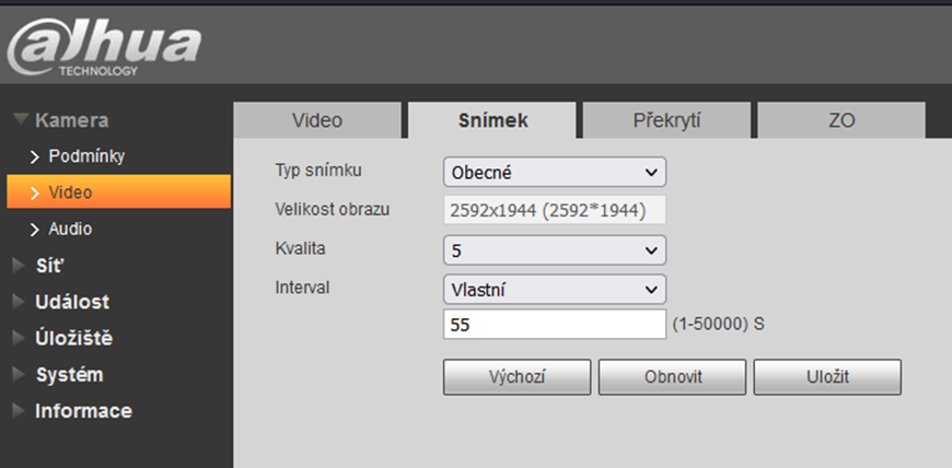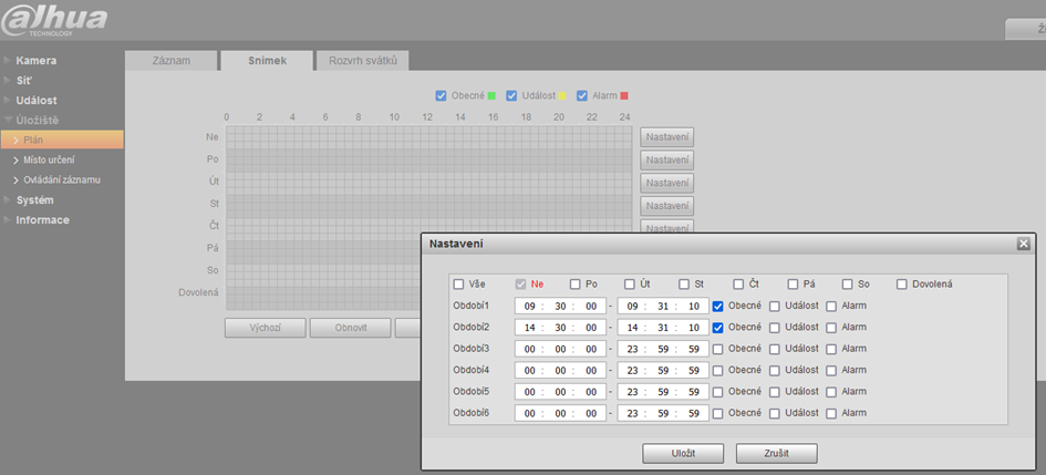 Ve Snapshotu nastavujeme parametry rámců. V sekci Kalendář nastavíme dobu pro ukládání snímků. V sekci Úložiště nastavíme cíl úložiště FTP a nastavíme parametry FTP.