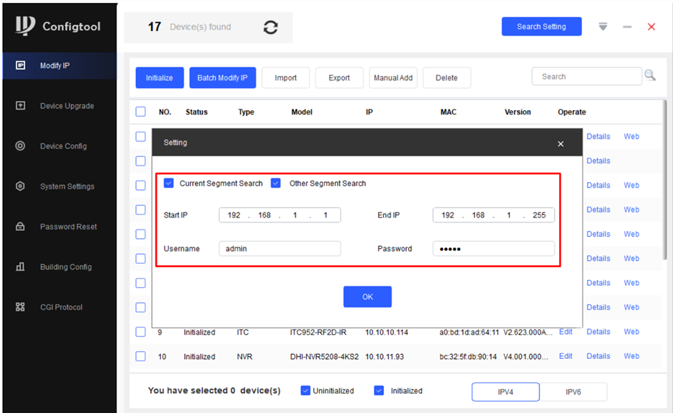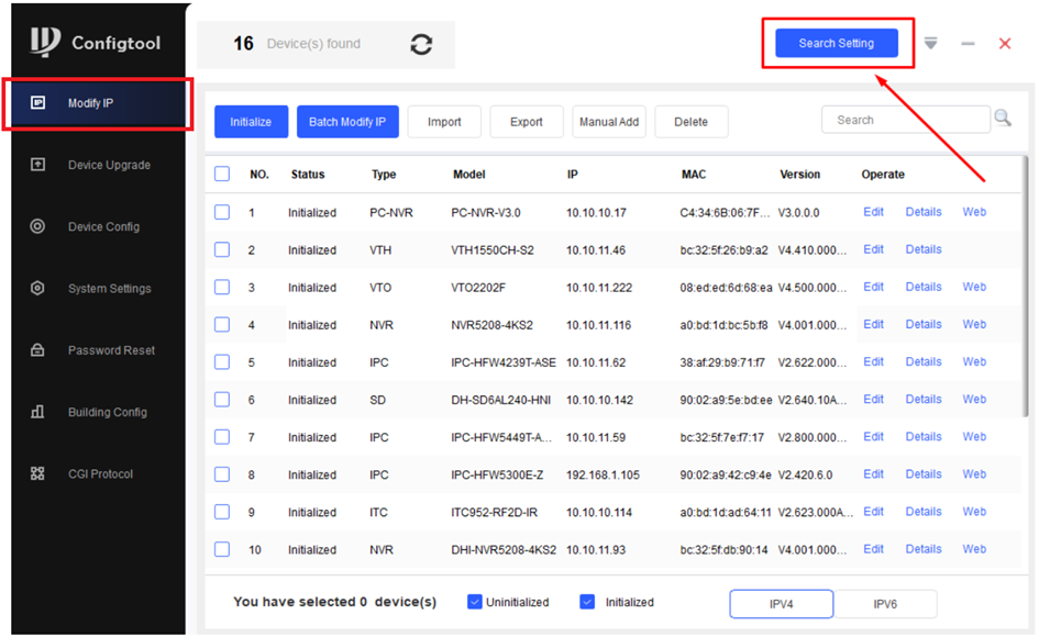 - Po spuštění aplikace je nutné vyhledat zařízení, jehož firmvér chceme aktualizovat. V levé části klikneme na kartu Modify IP a následně klikneme na Search Setting.