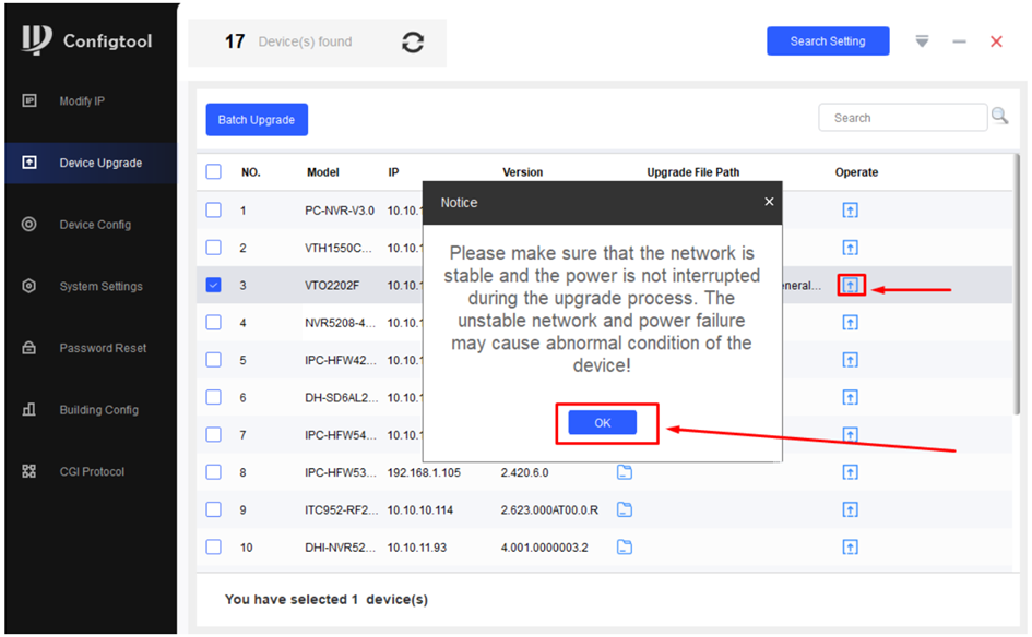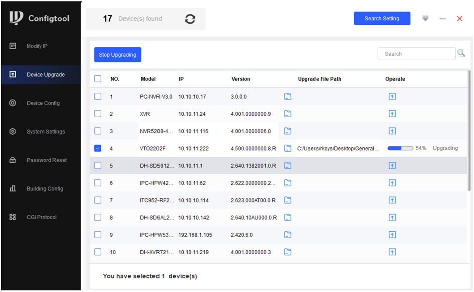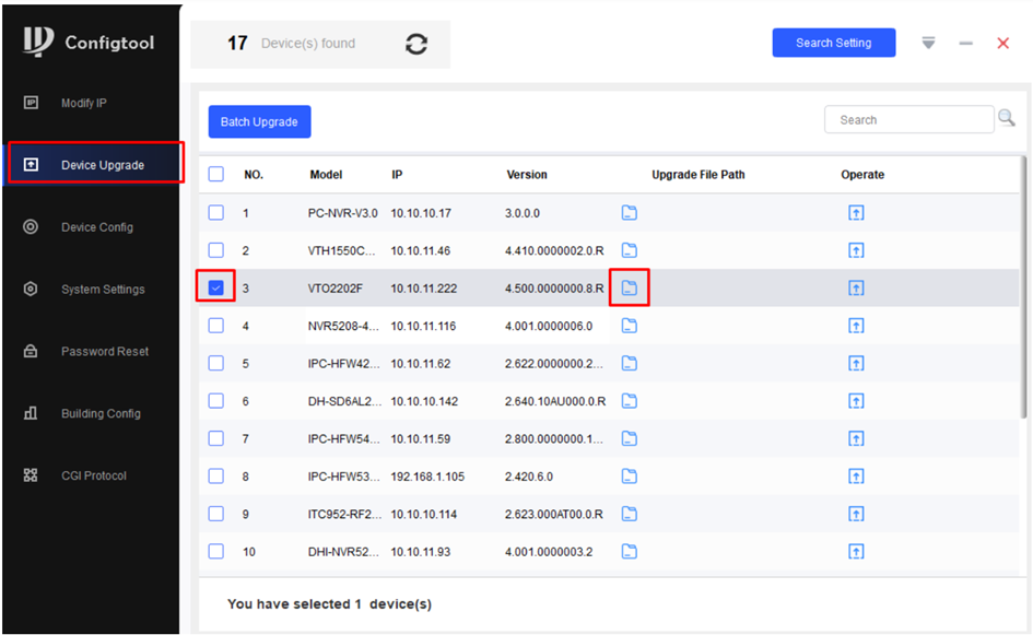- • Na kartě Device upgrade označíme jedno nebo více zařízení, které chceme aktualizovat a klikneme na ikonku Soubor.