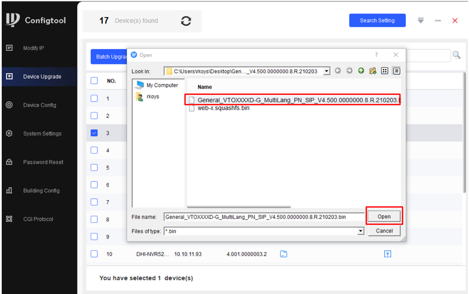 - Vybereme soubor obsahující firmvér a klikneme na tlačítko Open.