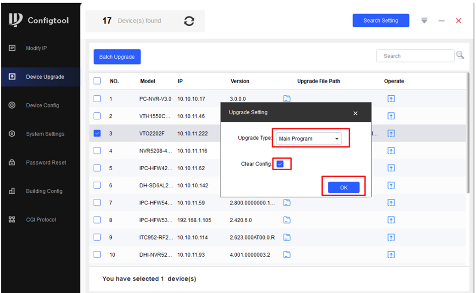 - Následně vybereme Main Program, označíme možnost Clear Config a klikneme na tlačítko OK.