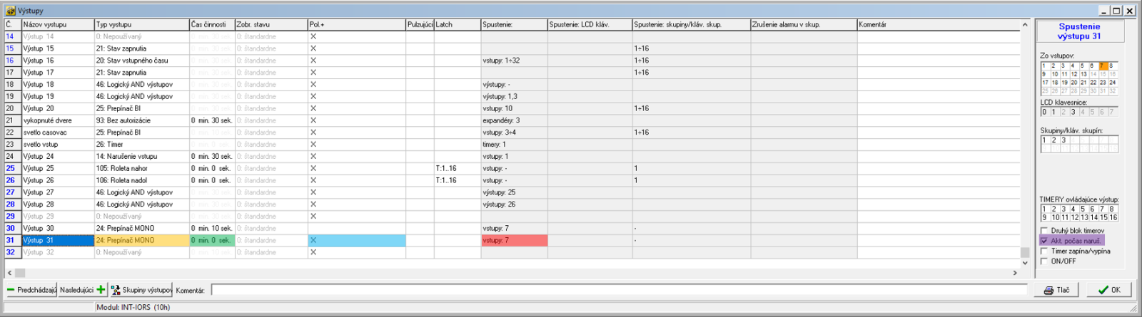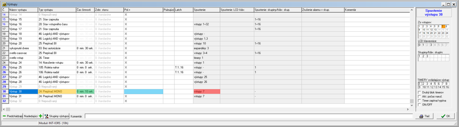Ve výstupech nastavte virtuální výstup (č. 30) na Typ výstupu 24: Přepínač MONO, čas činnosti nastavte po jak dlouhém čase od narušení vstupu (č. 7) chcete, aby byl výstup sepnutý. Je potřeba nastavit opačnou polaritu.