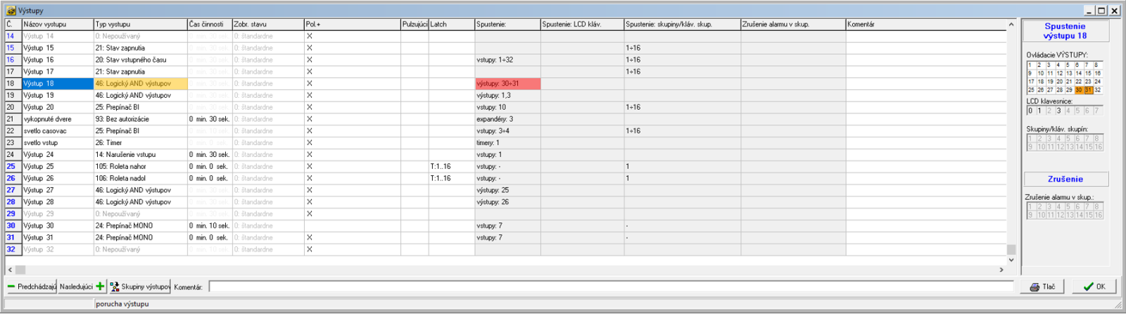 Hardwarový výstup (č. 18) nastavte na Typ výstupu 46: Logický AND výstupů a přidejte virtuální výstupy (č. 30, 31), které jste nastavili v předcházejících krocích.